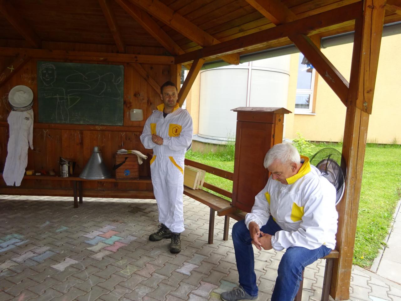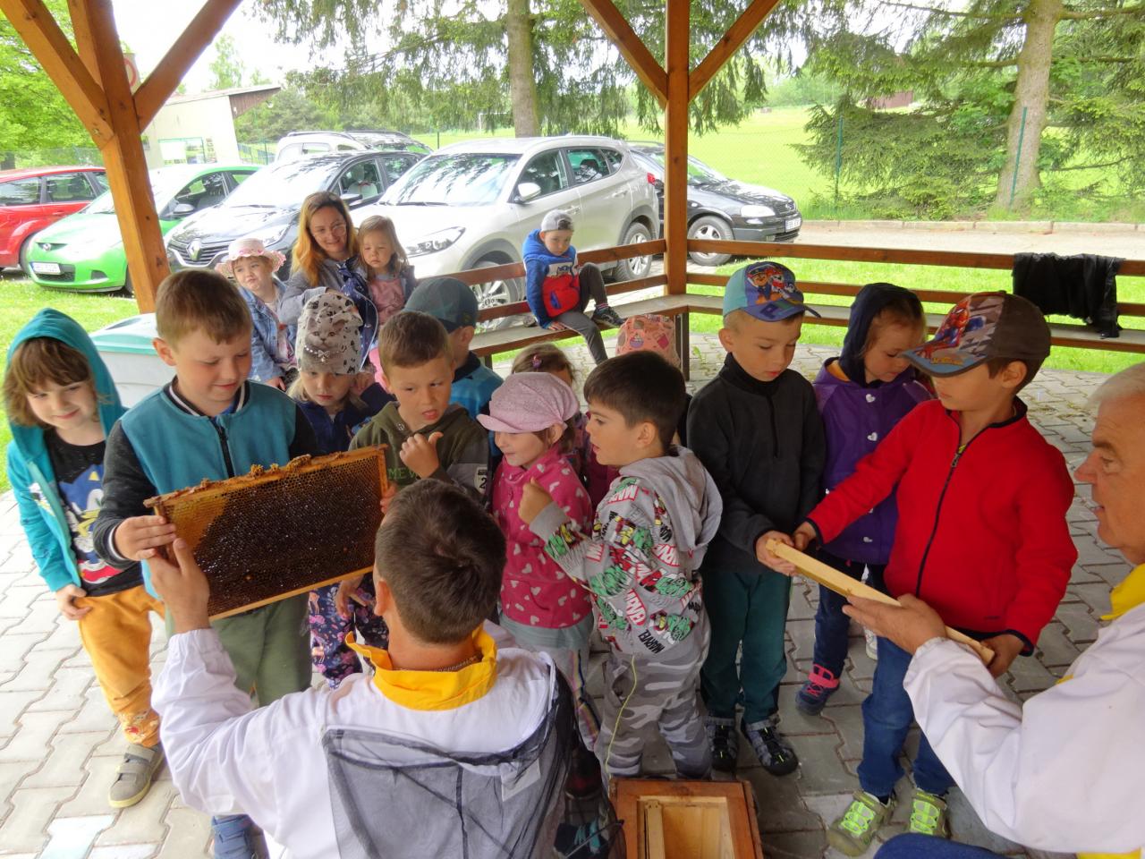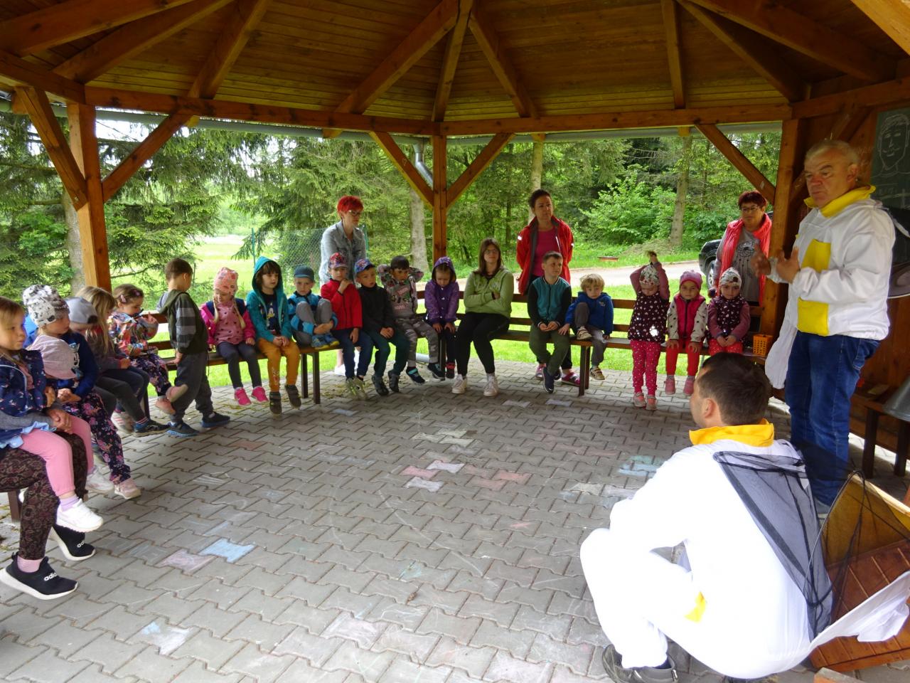 V pátek 26. 5. 2023 jsme si v MŠ užili další projektový den. Tentokrát nás navštívil včelař pan Hofman se svým kolegou. V altánu školy, kde beseda probíhala, byly k vidění kromě obleku pro včelaře, také předměty související s chovem včel. Děti si mohly vše prohlédnout, osahat a zeptat se na vše, co je zajímalo. Největším zážitkem pro děti byla ukázka včelstva. Na závěr děti dostaly sladkou odměnu v podobě ochutnávky medu.