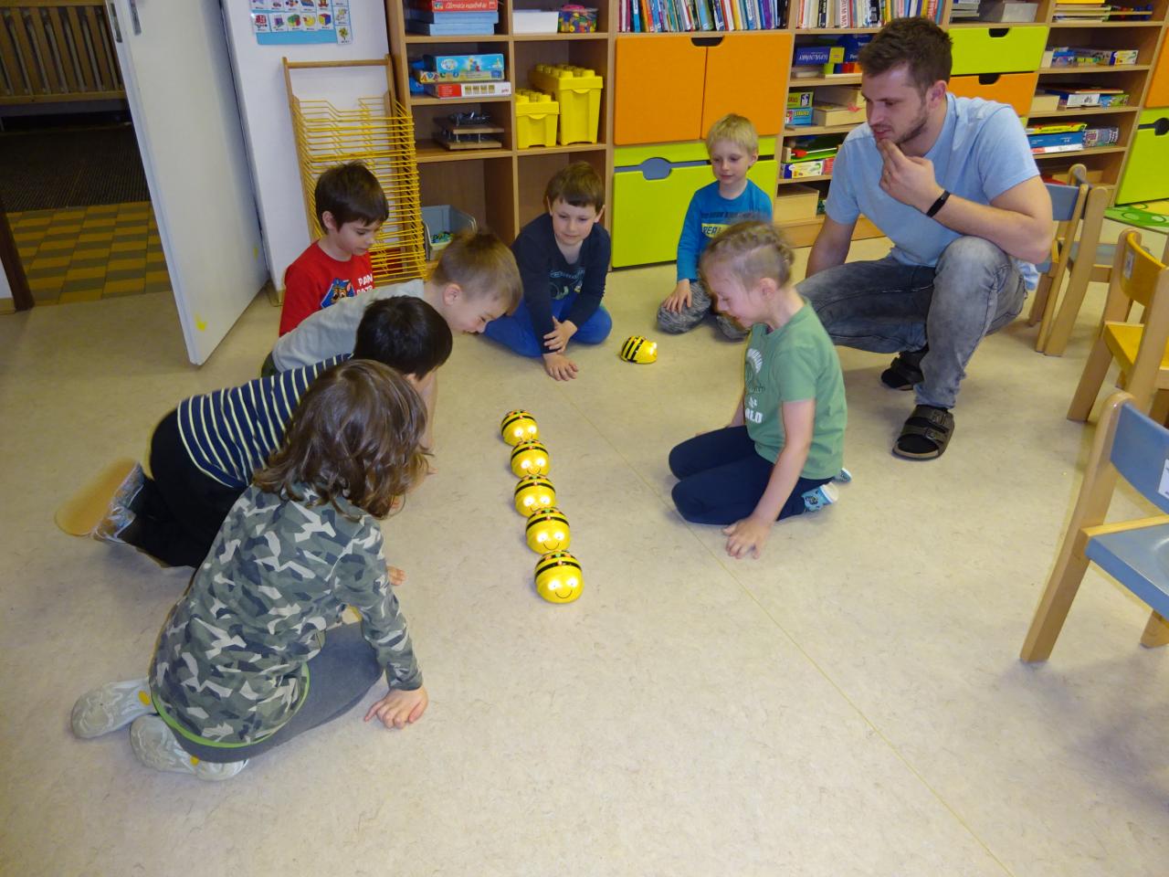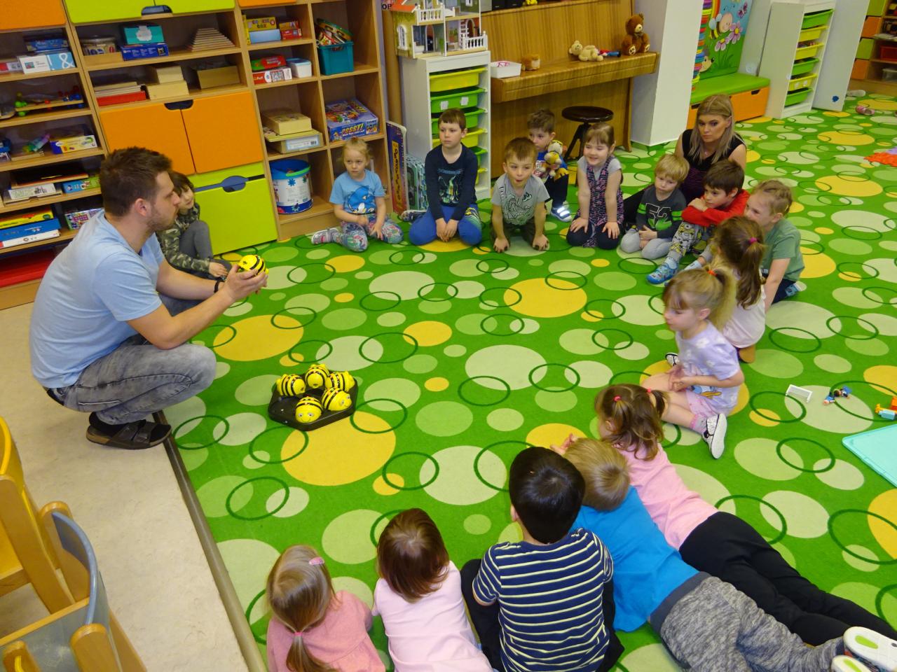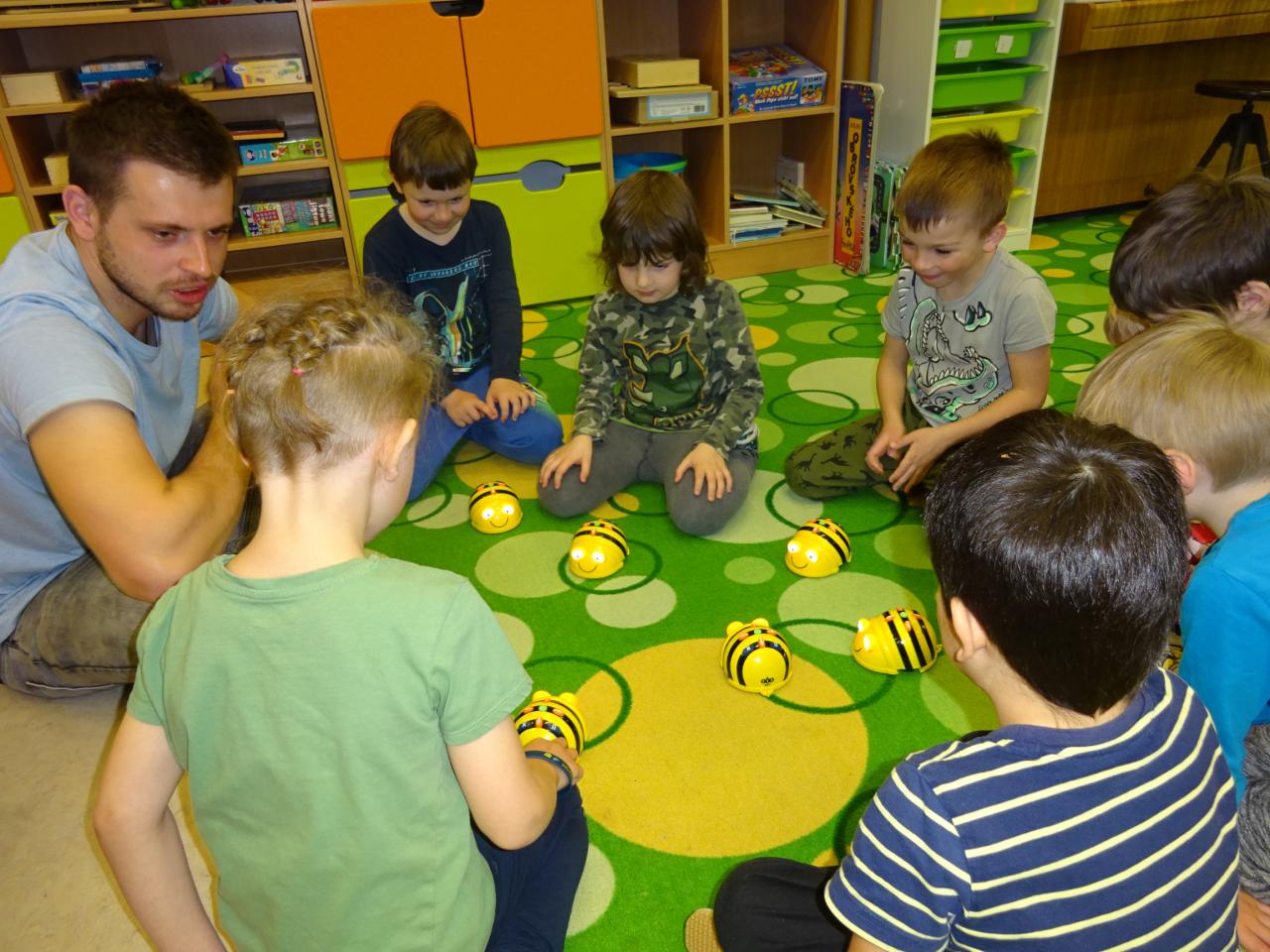 Děti se učily pracovat s robotickými včelkami, které budeme využívat v MŠ na rozvoj prostorového vnímání, dovedností a informatického myšlení a matematických schopností.