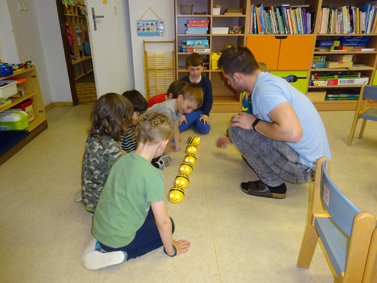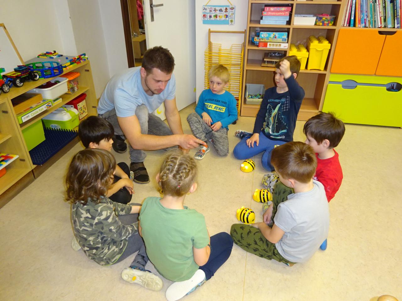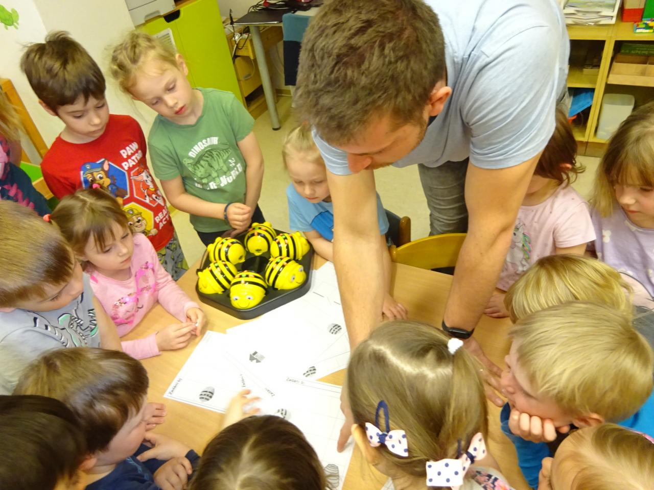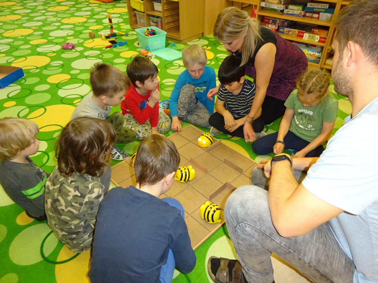 Děti se učily pracovat s robotickými včelkami, které budeme využívat v MŠ na rozvoj prostorového vnímání, dovedností a informatického myšlení a matematických schopností.