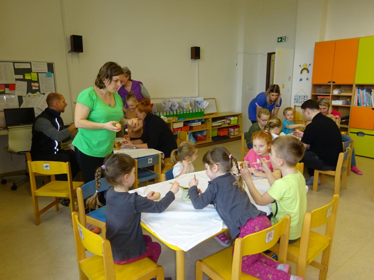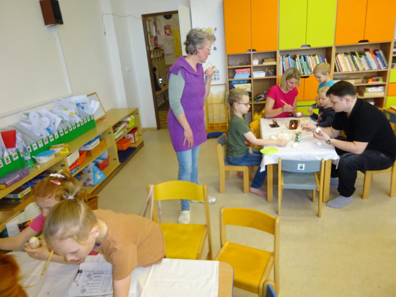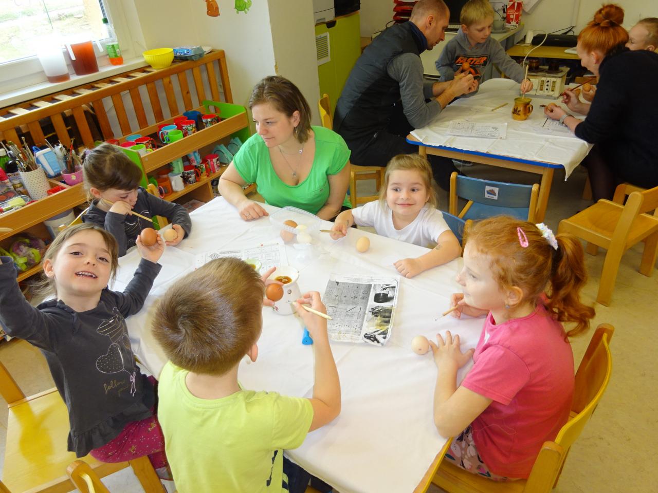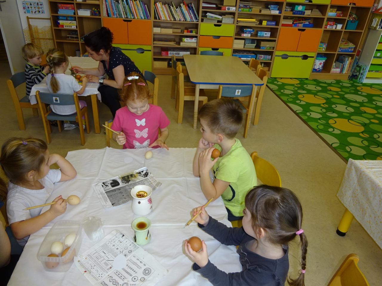 Nejdříve se děti dozvěděly něco o technice zdobení, prohlédly si ukázky různých vzorů a pustily se do práce. S pomocí rodičů vytvořily originální kraslice, které jsme také obarvili.