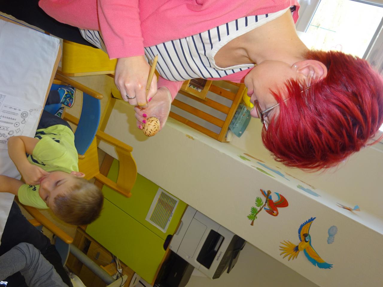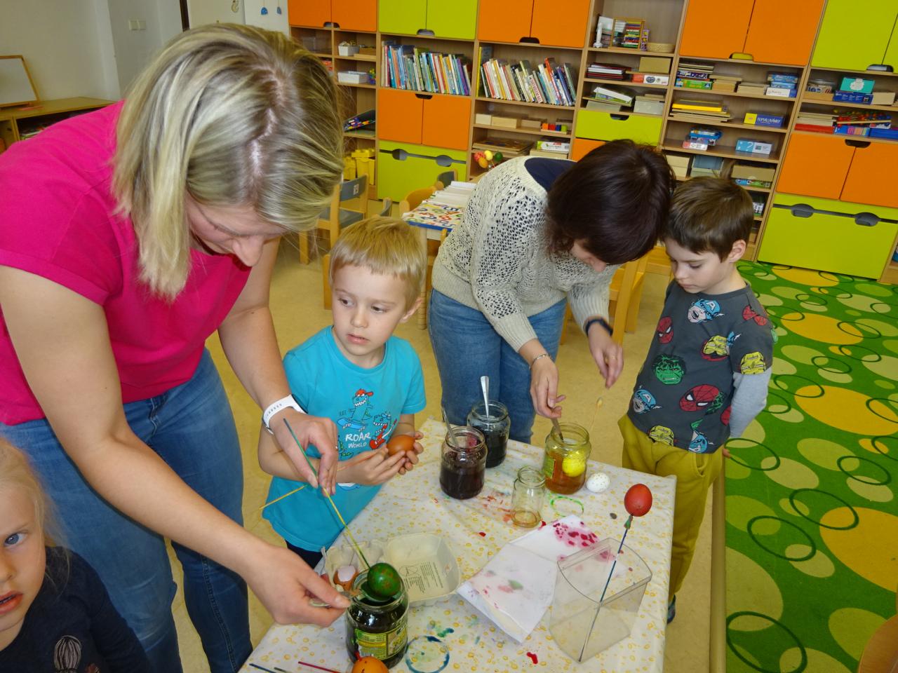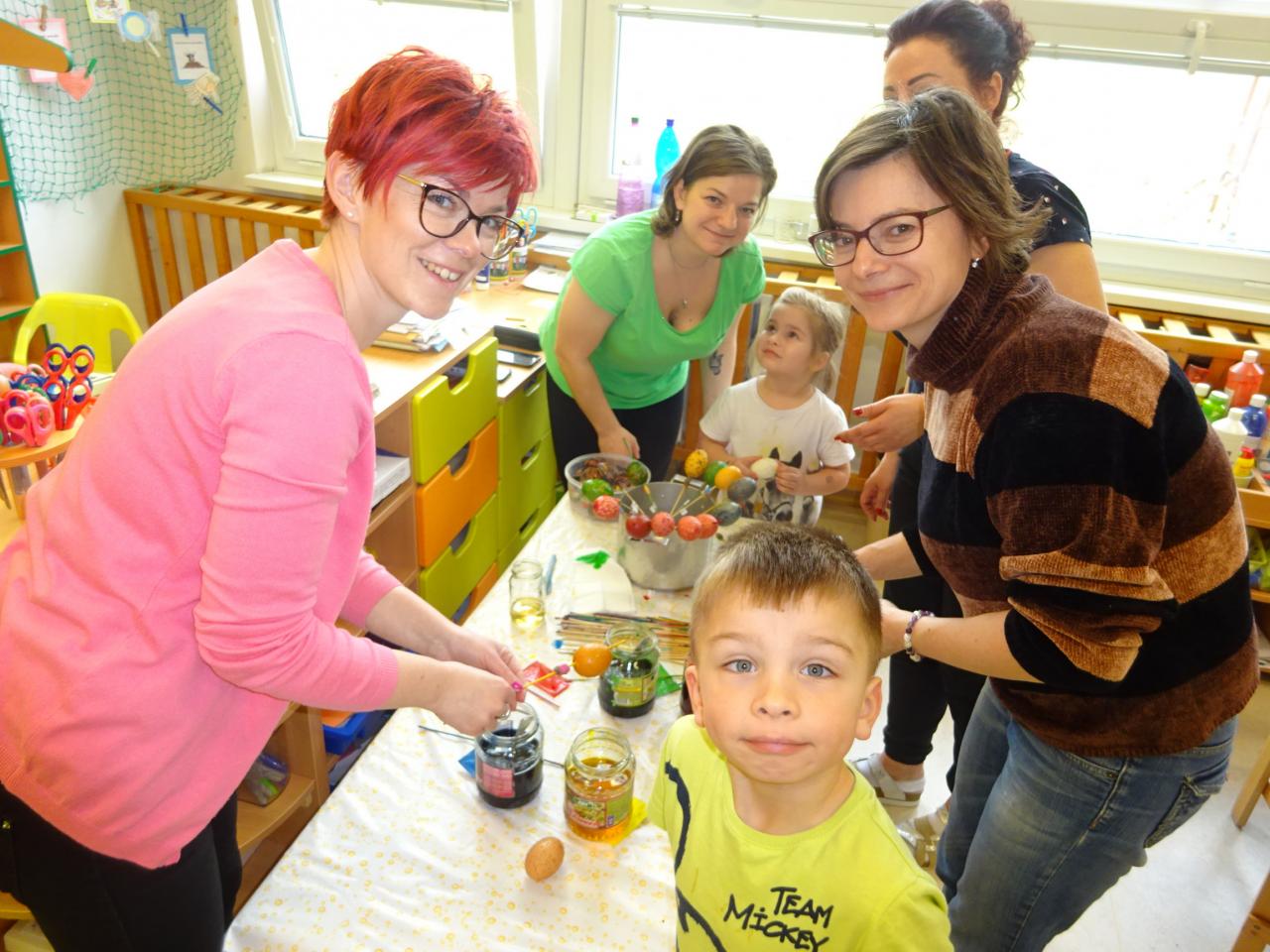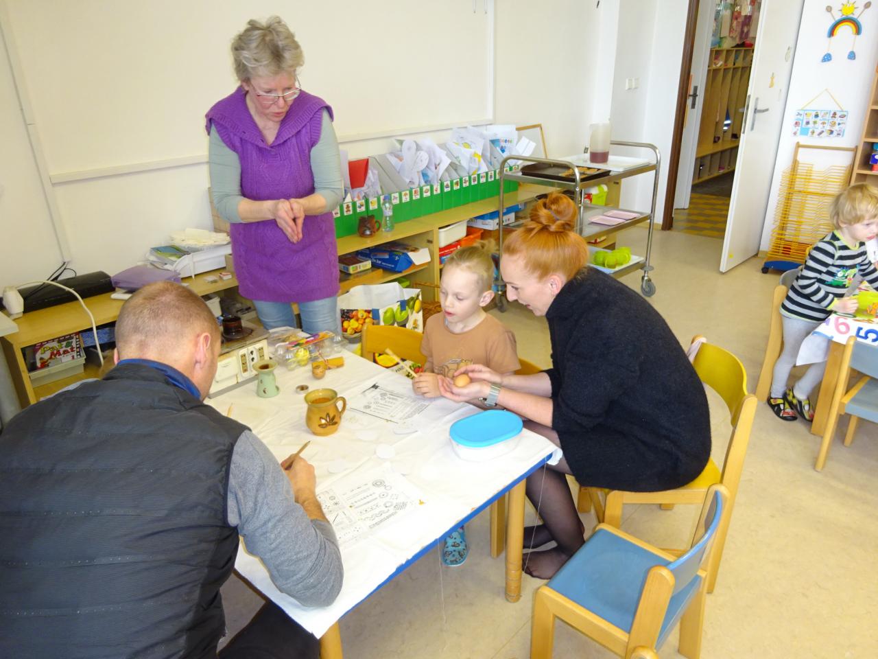 Nejdříve se děti dozvěděly něco o technice zdobení, prohlédly si ukázky různých vzorů a pustily se do práce. S pomocí rodičů vytvořily originální kraslice, které jsme také obarvili.