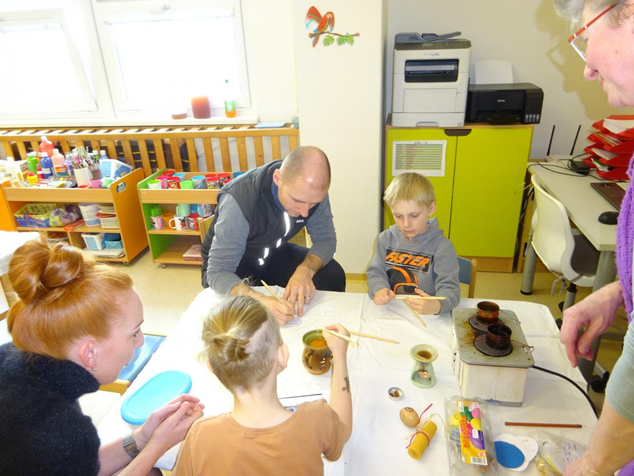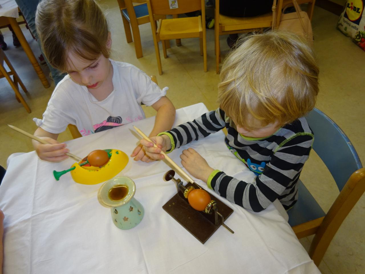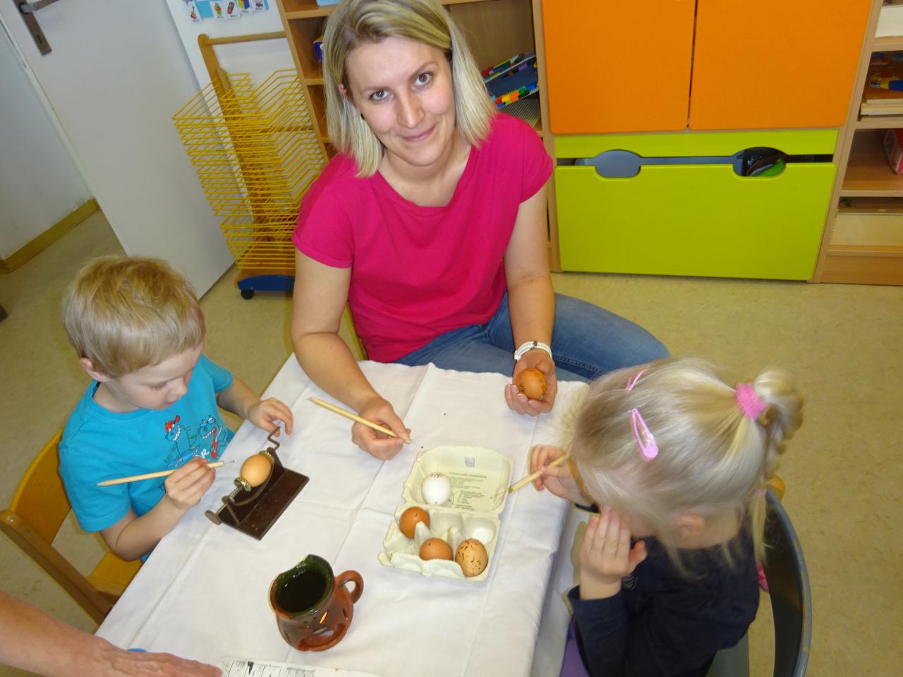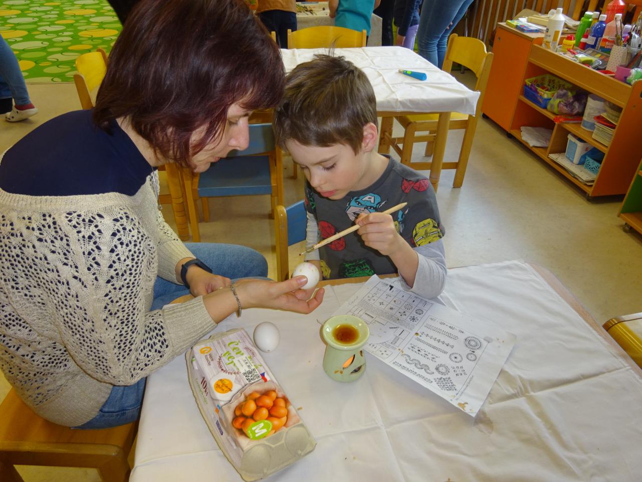 Pod vedením Jany Zemánkové si děti společně s rodiči vyzkoušeli zdobení kraslic voskem.