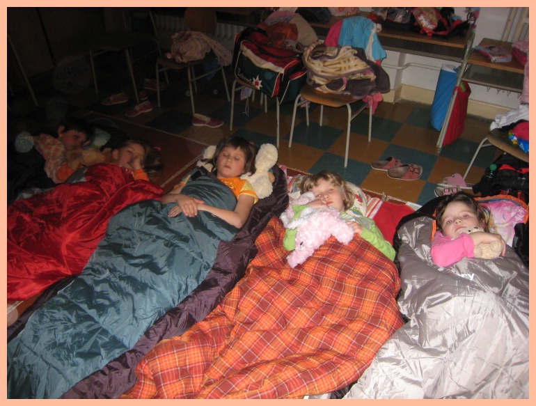 Ten pak uschovaly do ptáčka a zavěsily na pohádkový strom do hnízdečka. To už ale dětem vyhládlo, tak se posilnily večeří od maminky a zapily pohádkovým medovým čajem. Rodiče jim pomohli nachystat ve třídě pelíšek a pak už jen pac a pusu, rozloučení a hurá na promítanou pohádku, aby si trošku vydechly. Hned po vyčištění zubů se četlo. Začali jsme pozdravem českého velvyslance v Dánsku. To už byl ale každý ve svém spacáku a se svým plyšákem. Neplakal vůbec nikdo – možná maminky doma. Některé děti usnuly už při první pohádce Ošklivé káčátko, některým nestačil ani Pasáček vepřů. Všechny ale spaly o půl desáté.