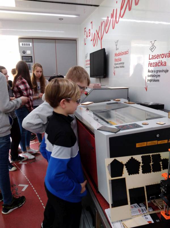 Uplynulé dva týdny parkovala na Růžovém náměstí v Boskovicích. Příležitost k návštěvě tohoto speciálního návěsu jsme využili i my. Pro žáky 8. ročníku zde byl v rámci projektu PolyGram připraven workshop zaměřený na laserovou řezačku.